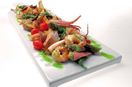 Mezclar en un bol la sal, la pimienta, el aceto y el aceite de oliva. Condimentar la ensalada y servirla agregando el salteado de mar tibio.