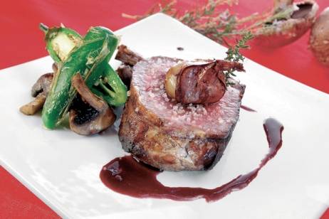 Servir junto con la salsa de vino, los hongos, las échalotes y los pimientos.